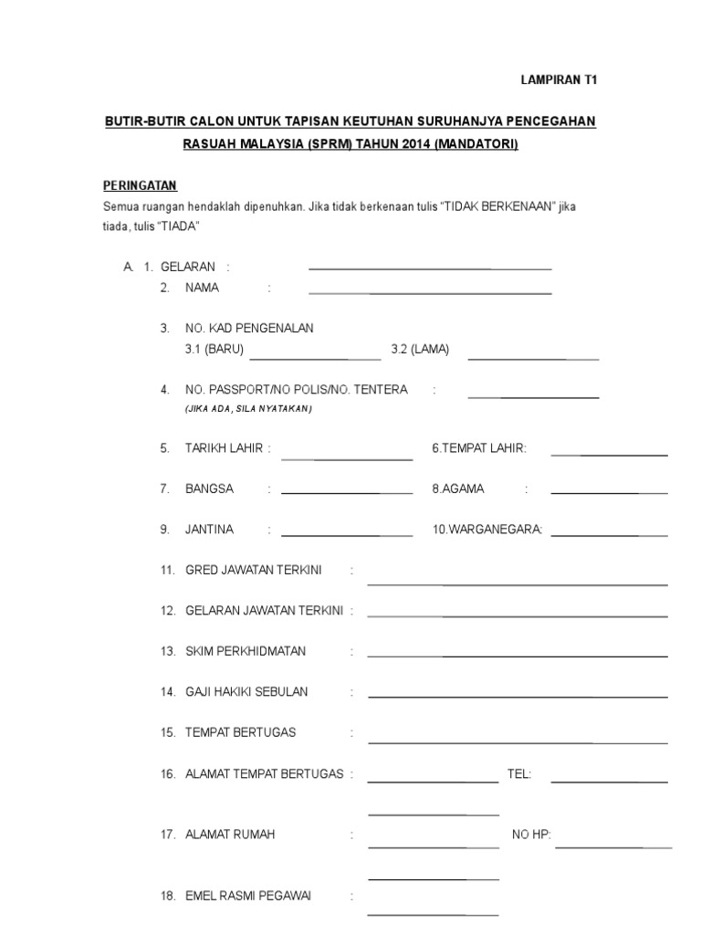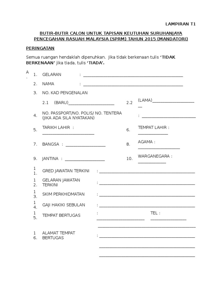 Lampiran T1 Butir Butir Calon Untuk Tapisan Keutuhan Suruhanjaya Pencegahan Rasuah Malaysia Sprm Tahun 2014 Mandatori Peringatan