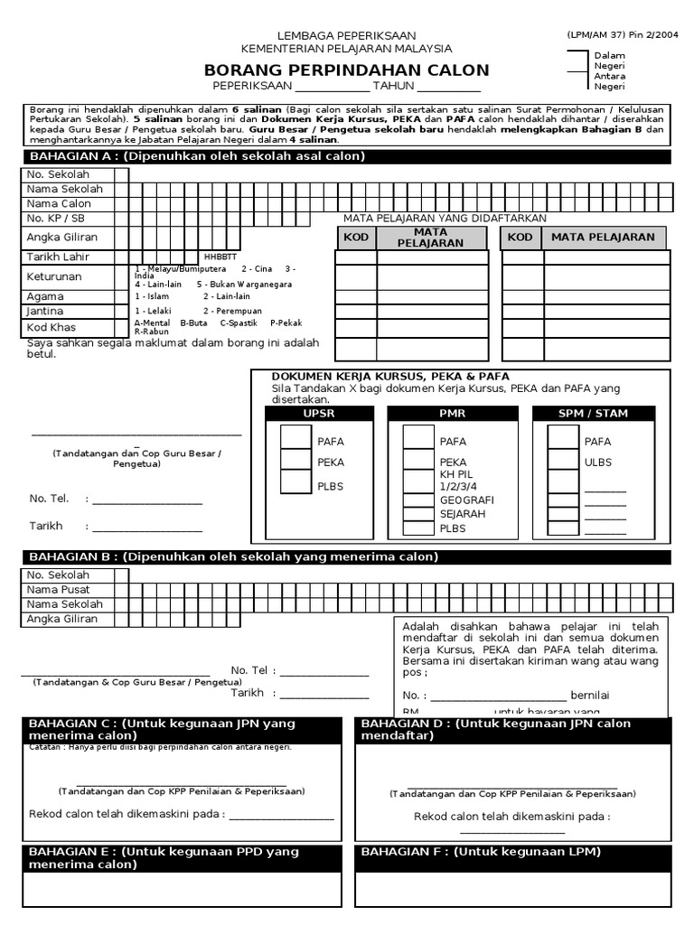Borang Perpindahan Calon Lembaga Peperiksaan Kementerian Pelajaran Malaysia