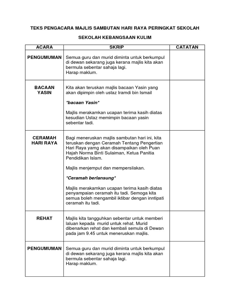Teks Pengacara Majlis Sambutan Hari Raya Peringkat Sekolah